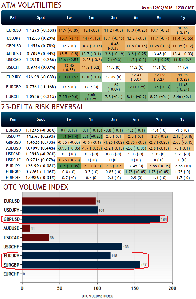 We think that the 18th - 19th February EU Summit will be the next risk event not only for the GBP but for some euro crosses outside euro zone such as EURJPY, EURUSD etc with significant implications for the timing of the EU Referendum. As a result OTC market positions are getting intensified, see IVs for all euro crosses are spiking up including EURCHF.