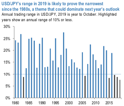 USDJPY’s range in 2019 is likely to prove the tightest since the 1980s, a theme that should dominate next year’s outlook too. Indeed, assuming USDJPY remains within its 2019 range thus far (104.10-112.40), this year’s range will be just 7.6% from peak to trough, the tightest since 1980. Trading ranges of 10% or less have been historically somewhat rare over the past few decades, so to have three consecutive years with USDJPY in such a narrow range is all the more unusual; USDJPY has been confined to a rough 105-115 range for three years now (refer 1st chart). We see three factors behind this trend.