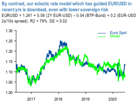 Second, the domestic political tail-risk to USD is increasing just as it is subsiding in the Euro area to judge from the narrowing in the odds on a Biden presidency and the potential for less-centrist policies under Biden compared to the pre-epidemic baseline.