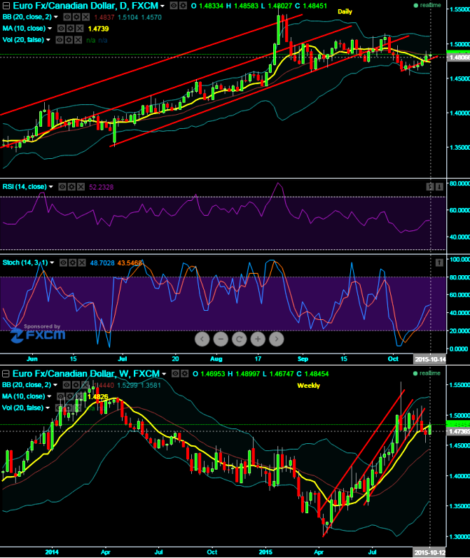 This afternoon slide in EURCAD has stalled on trendline support at 1.4802 levels, once again just below the morning low suggesting that EURCAD is susceptible to another spike higher if it holds this level on closing basis, otherwise it is a clear sell from this level. But on weekly charts, as you can observe s sharp long legged doji exactly at trendline support appeared that signifies more potential on downside.