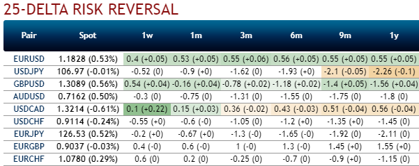 EUR risk reversals abating to indicate the hedging sentiments for consolidation phase looks appealing in the long run, as the fresh positive bids are added to the positive RRs across all the tenors (1st chart).
