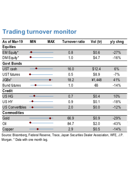 Volumes are monthly and the Turnover ratio is annualized (monthly trading volume annualized divided by the amount outstanding, refer 1stchart). UST Cash is primary dealer transactions in all US government securities. UST futures are from Bloomberg. JGBs are OTC volumes in all Japanese government securities. Bunds, Gold, Oil, and Copper are futures. Gold includes Gold ETFs. Min-Max chart is based on a Turnover ratio. For Bunds and Commodities, futures trading volumes are used while the outstanding amount is proxied by open interest. The diamond reflects the latest turnover observation. The thin blue line marks the distance between the min and max for the complete time series since Jan-2005 onwards. Y/Y change is the change in YTD notional volumes over the same period last year.