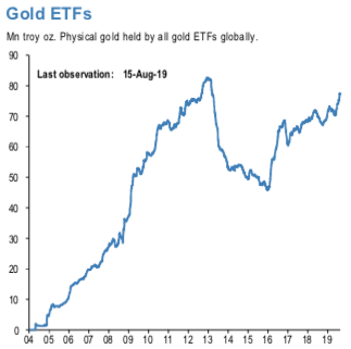 Well, yesterday, the total ETF holdings surged to 2,424.9 tons, the highest since 2013. Price of the precious yellow metal has constantly been gaining this year (gained about 15.72% since this May) as apprehensive investors are worried for the prevailing global slowdown and need safeguarding from the same, the relentless trade turmoil, geopolitical issues like Brexit, NAFTA etc and struggle in the bond market are indicating the U.S. is most likely headed for another recessionary phase.