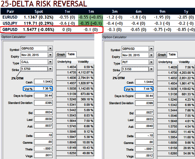 The cable's implied volatility of ATM is still perceived to be the least within next 1w-1m time frame in major G7 space (at around 6-7%), you can observe implied volatilities from the diagram: