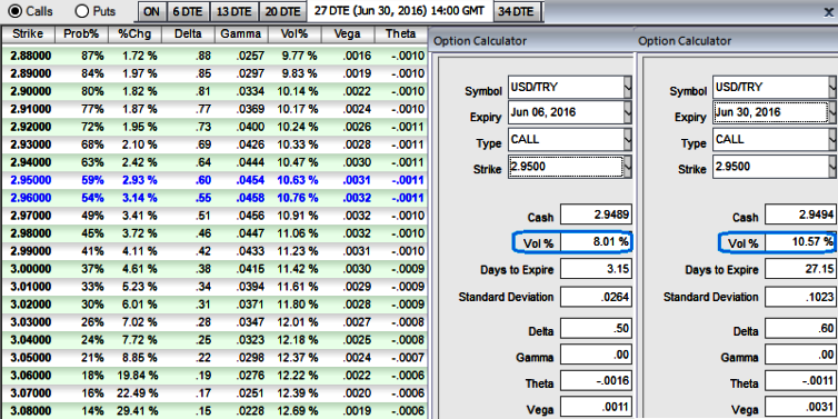 Please observe the payoff table, as USDTRY creeps up at spot ref: 2.9502 the strategy constructed above is likely to fetch positive cashflows on expiry (%change), OTM call strikes have healthy vega with higher vols.