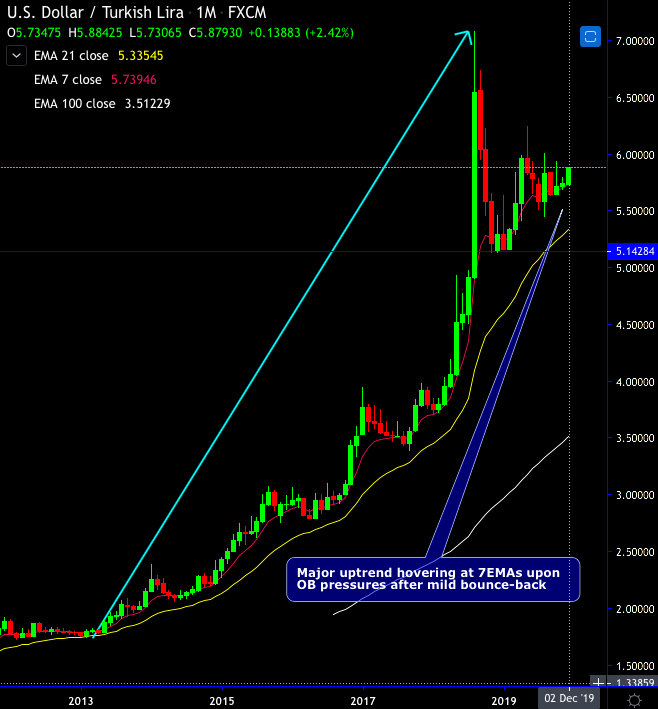 Hence, we continue to remain pessimistic on the lira outlook and project USDTRY to (indicatively) reach 6.60 by the end of H1’2020. Although the major uptrend seems to be little edgy, bulls are hovering at 7-EMAs upon mild overbought pressures after the mild bounce-back from 2-3 months (refer 1st chart). It is a little surprising that EM FX vols have under-reacted so severely to the bearish global impulses that have been in train all year.