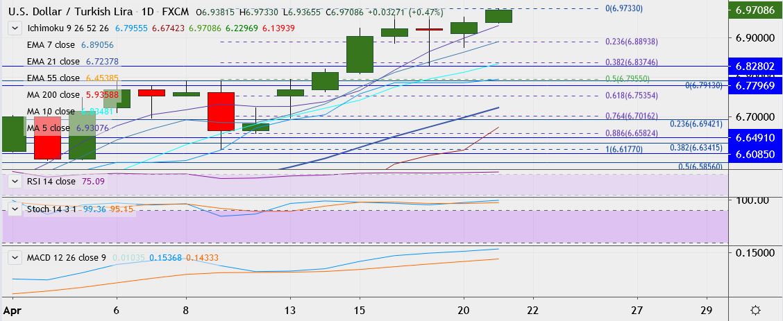 - USD/TRY is trading 0.5 percent higher at 6.9709, having hit a high of 6.9733 earlier, its highest since August 2018.