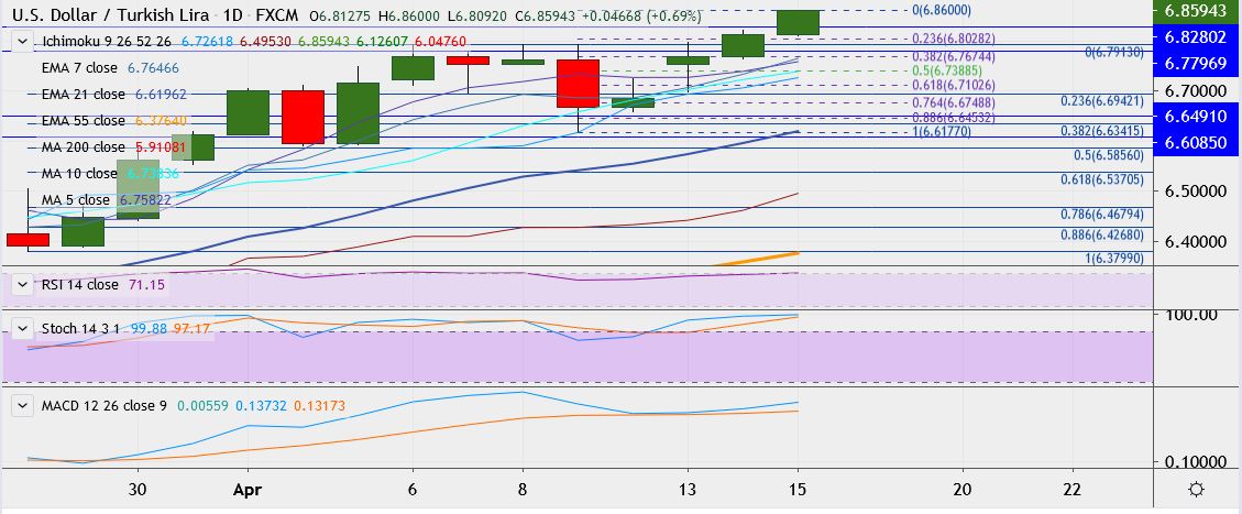 - USD/TRY is trading 0.7 percent higher at 6.8588, having hit a high of 6.8600 earlier, its highest since August 2018.