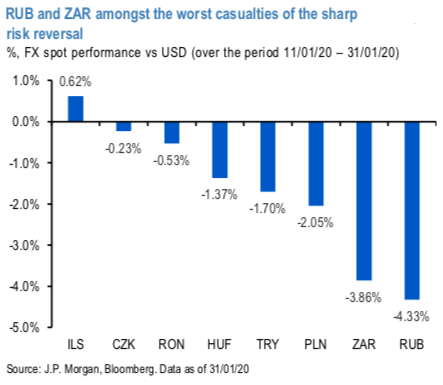 Mounting apprehensions and anxiety revolving around the coronavirus that has seen markets come under pressure. Since the first fatality related to the coronavirus was announced in January, the risk aversion has come to the fore in EMEA EM FX, with both RUB and ZAR amongst the worst casualties of the sharp risk reversal (refer 1st chart). The market continued to trade poorly as global sentiment also deteriorated.