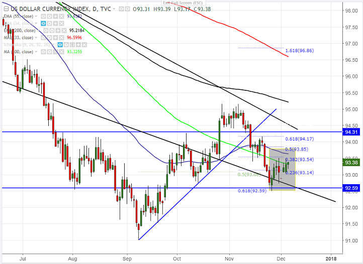 - DXY has formed a bottom at 92.50 and showing a minor recovery from that level. The index jumped till 93.51 and is consolidating between 93.49 and 93.04 for past two trading. It is currently trading around 93.37.