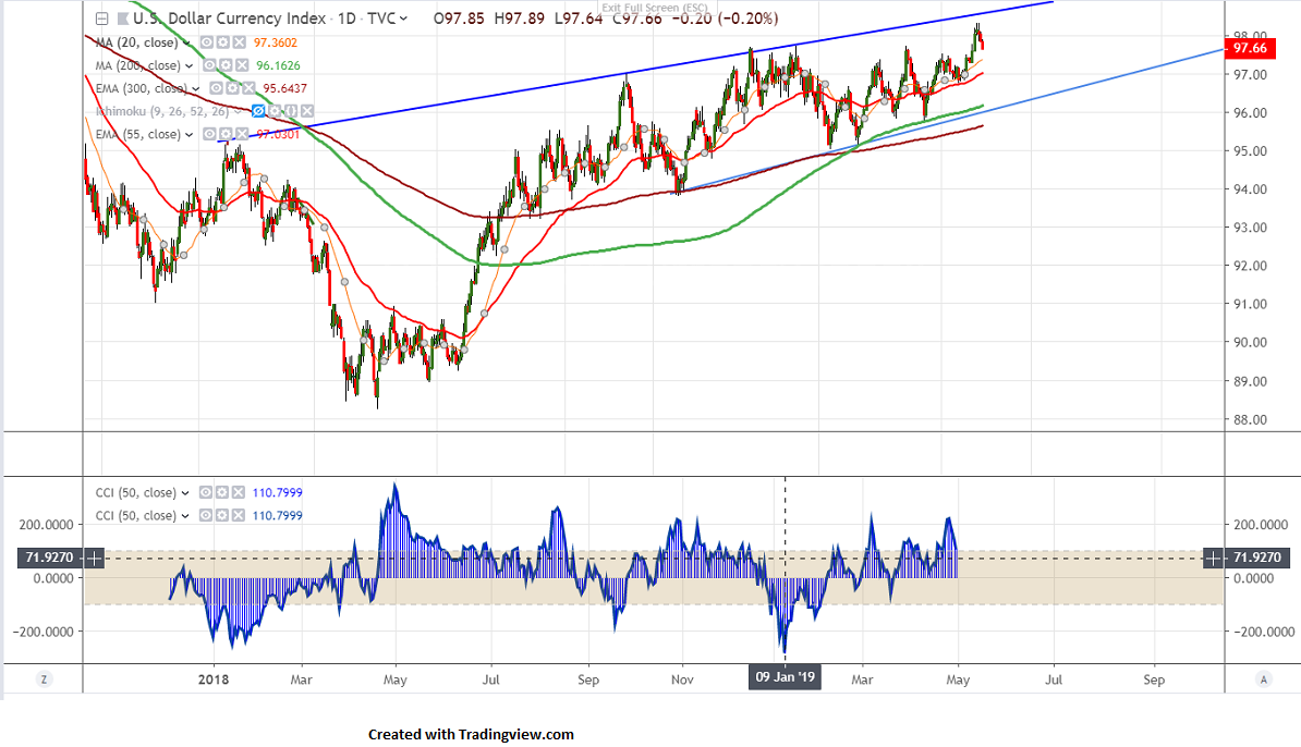 The near term support is around 97.58 (10- day MA) and any violation will drag the index till 97.34 (20- day MA)/97 (55- day EMA).It should break below 96.75 for further weakness.