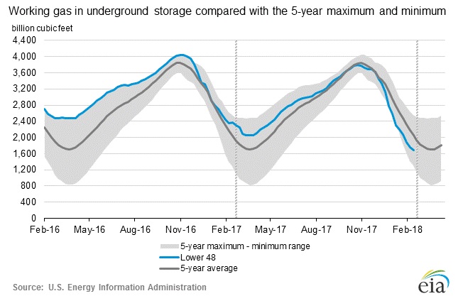 - Gas price had moved higher as the inventories are declined fast due to polar vortex and the market is currently pricing that the storage is likely to drop to 1.24 trillion cubic feet by the end of the winter. However, as the contract shifted it is declining sharply as the end of winter nears.