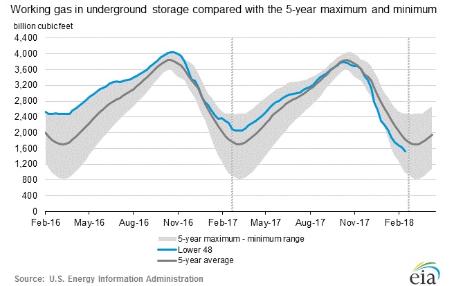 According to the latest numbers, working gas in the underground storage remains at 1.532 trillion cubic feet (Tcf). Stocks are 718 billion cubic feet (Bcf) lower than last year at this time and 296 Bcf below the five-year average. The chart from EIA shows the level of inventory. The second chart from investing.com shows weekly changes in inventory.