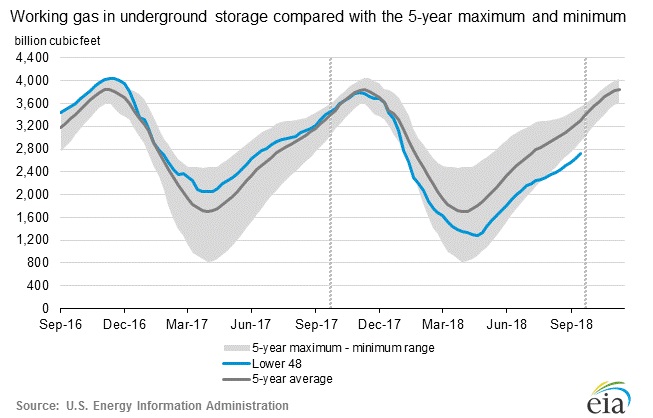 According to the latest numbers, working gas in the underground storage remains at 2.722 trillion cubic feet (Tcf). Stocks are 672 Bcf less than last year at this time and 586 Bcf below the five-year average. The chart from EIA shows the level of inventory. The second chart from investing.com shows weekly changes in inventory.