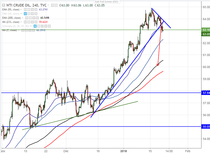 - The commodity has broken major trend lien support at $63.35 and this confi9rms minor weakness, a decline till $62.28/$60.50 likely.
