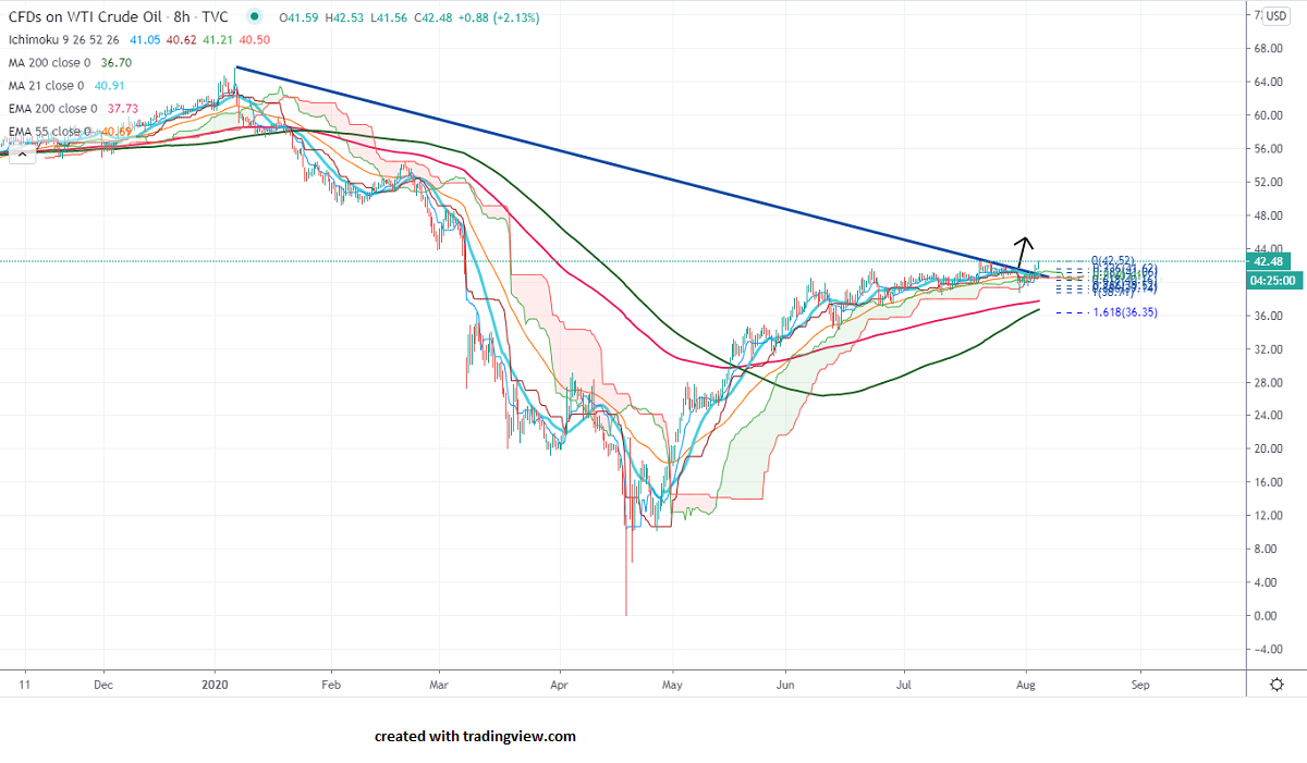 WTI crude oil is extremely higher and broken major trend line resistance at $41.20 and hits an intraday high oat $42.41. The jump was mainly due to bomb blast in Lebanon's main port which has increased instability in the region. The American Petroleum Institute reported a decrease of 8.59 million barrels in US crude inventory last week. Markets eye EIA inventory report for further direction.