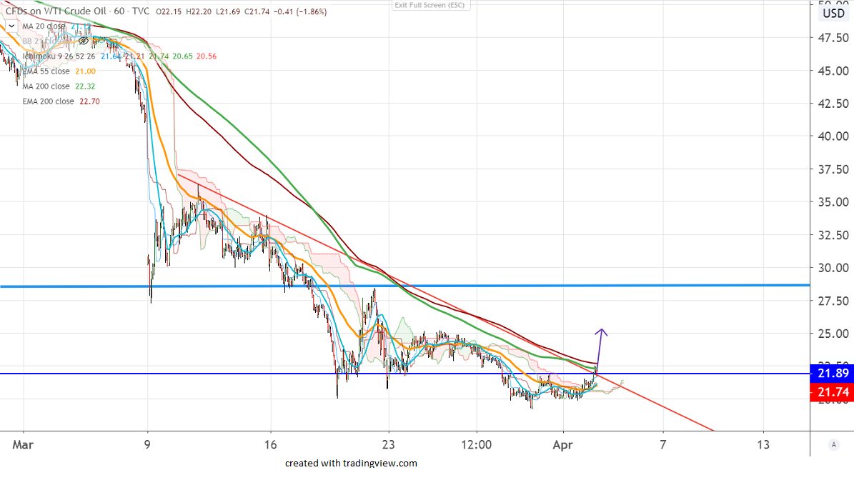 US oil has shown a massive recovery of more than $3 from a low of $19.25. It was one of the worst performers this year and lost more than 70% from minor top $65.62 made on Jan 8th, 2020. The decline was mainly due to price war and the spread of coronavirus which has affected global demand.
