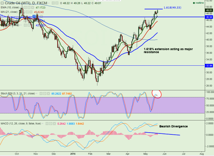 - US oil has gained drastically after making a low of 46.72 yesterday. The commodity has broken $48.91 (18 the May High) today morning and jumped till $49.26.