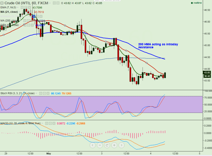 - The commodity has broken minor resistance $43.65 (Hourly Tenken –Sen) and jumped till $43.77 at the time of writing. Crude should break above $44.50 (200 HMA) for further bullishness. Any indicative break above $44.50 will take the pair to next level till $45.32/$46.