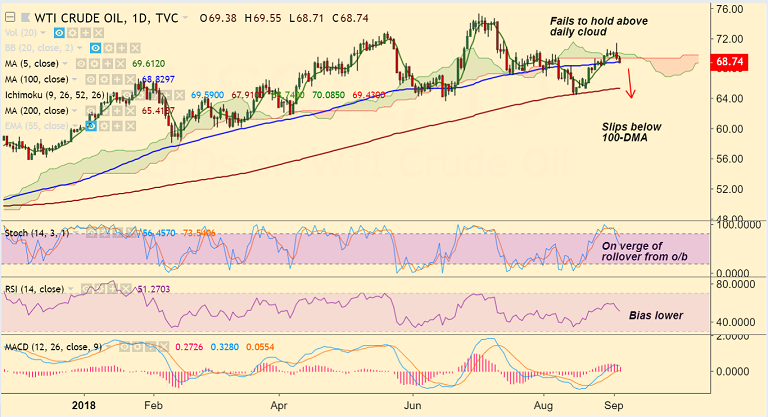 - US Oil fails to hold above daily cloud, slips below 100-DMA at 68.83.