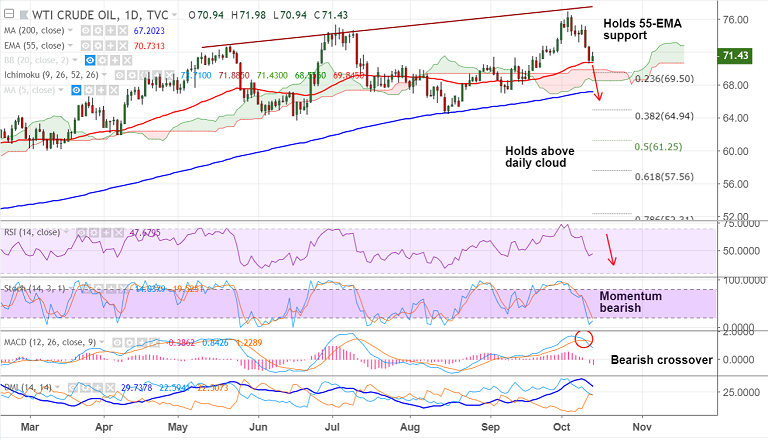 - WTI has retraced above 71 mark and is currently trading at 71.34.