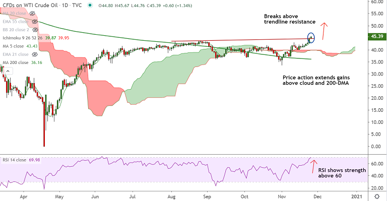 On the flipside, 5-DMA is immediate support at 43.43. Retrace below 42.24 (55W EMA) will negate bullish bias.