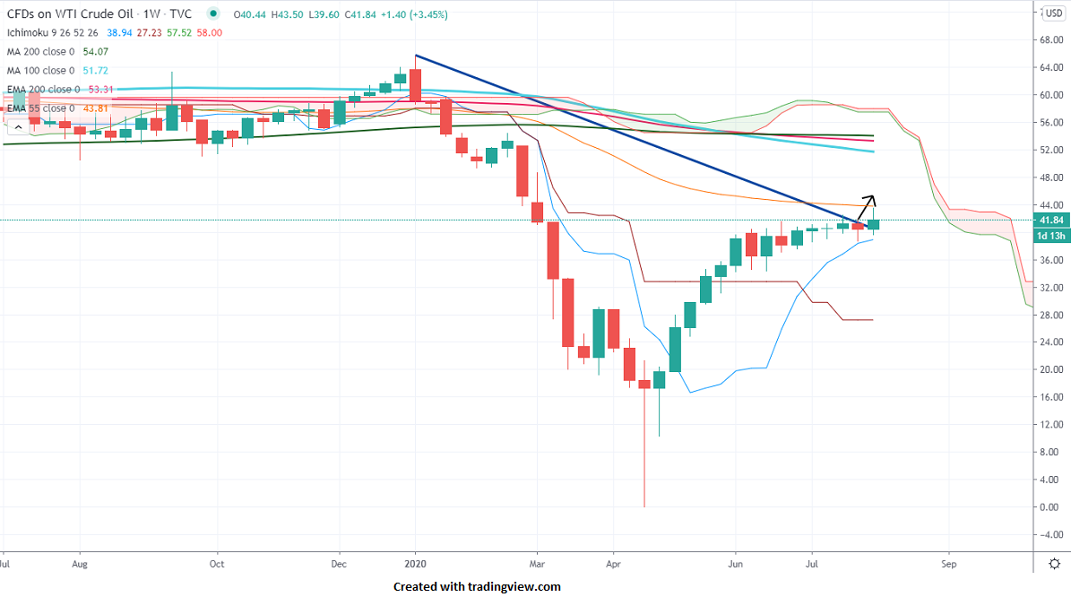 WTI crude oil jumped more than $2 yesterday to $43.50 and started to decline from that level. The jump came after better than expected US EIA crude inventory report. The inventory fell last week by -7.4M compared to an estimate of -3.4M. But the US-China trade tension and spread of the second wave of coronavirus is putting pressure on oil at higher levels.