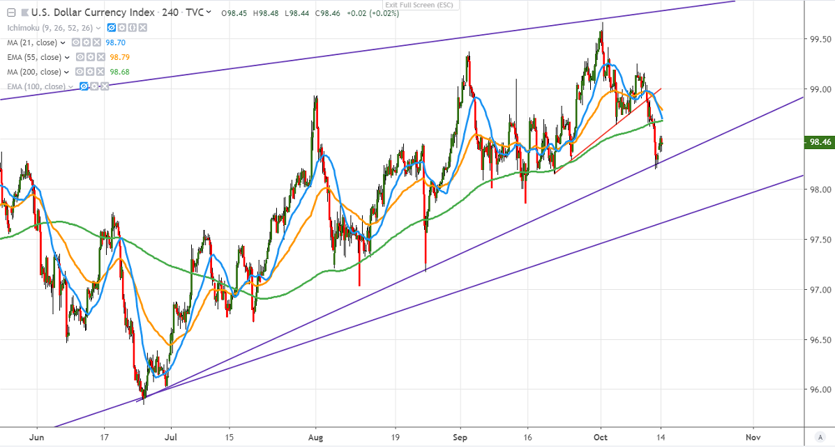 US dollar index has taken support near the trend line and shown a minor recovery. It hits a high of 98.53 and is currently trading around 98.47. DXY was trading weak for the past two weeks and lost more than 150 pips on weak US economic data.