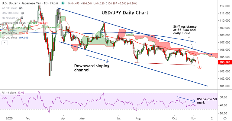 USD/JPY erased most of the gains on Wednesday to close 0.07% higher at 104.49. Stiff resistance was seen at 55-EMA and daily cloud.