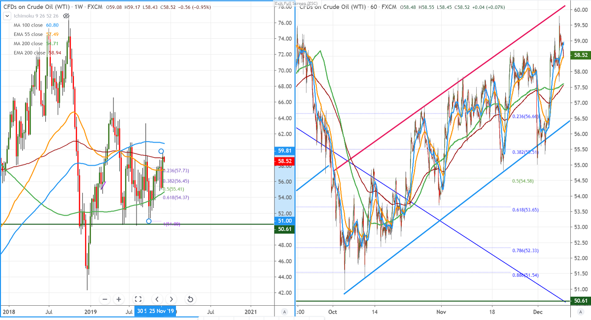 Technically, the commodity is struggling to close over $58.95 (200-W EMA). This confirms minor weakness, a dip till $57.40/$56.45/$55 possible.