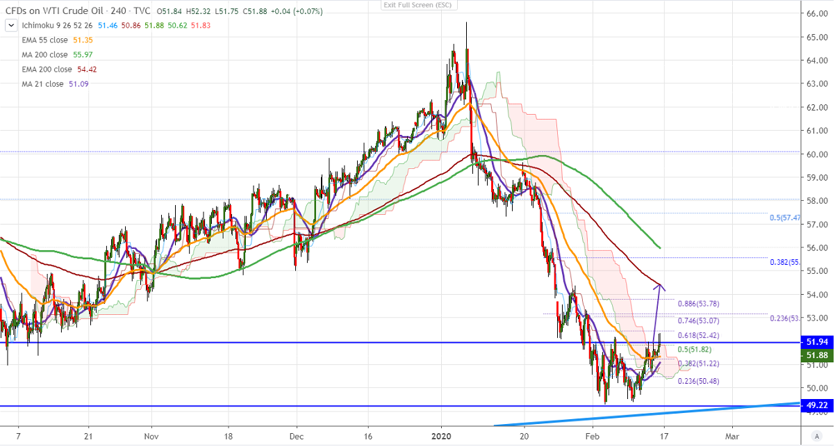 WTI crude oil continues to trade higher after a minor decline till $50.60. The decline came after weak inventory data. US EIA has reported that US crude oil supplies rose by 7.5 million barrels compared to 2.93 million barrels. It hits a high of $52.29 and is currently trading around $52.13.
