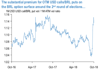 The eye popping 140 vol pricing of Brazil election in USDBRL overnights a few weeks ago has given way to a much more meager 2ndround O/N pricing of 53 vol currently, implying a breakeven spot move of 2% on the day.
