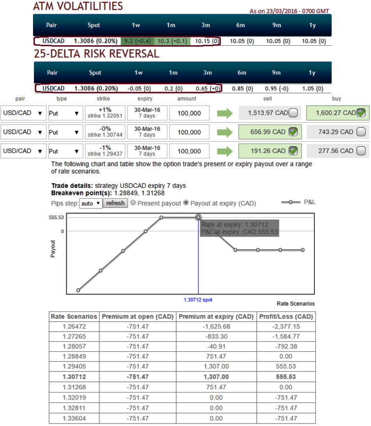 At spot ref: 1.3074, go long in 2M USD/CAD put ladder (strikes 1.3205/1.3074/1.2943).