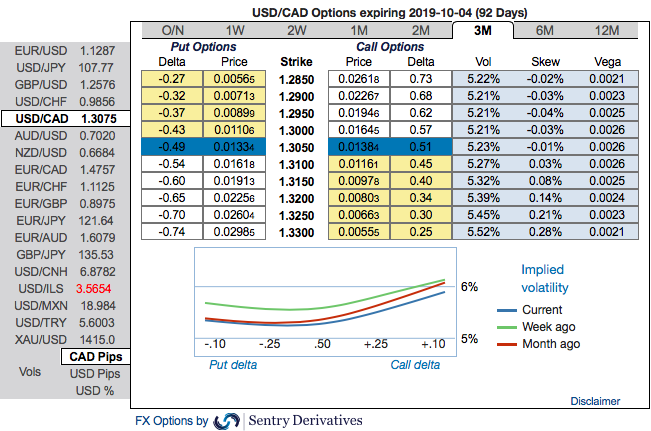 At spot reference: 1.3075 level while articulating, we advocate diagonal debit call options spreads foreseeing both mild downswings in the near-term and the major uptrend. Positively skewed IVs of 3m tenors are indicating upside risks with OTM bids up to 1.33 level. Bullish neutral risk reversal numbers substantiate this bullish stance coupled with 1m skews that are well-balanced on either side.