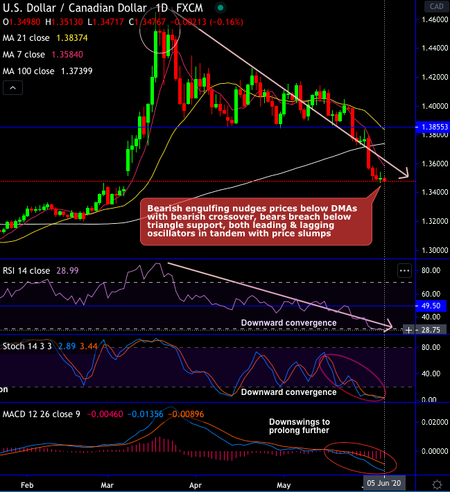 As stated in our previous post, USDCAD bears are intensified upon breakdown below triangle support.Bearish engulfing patterns nudge prices below DMAs with bearish crossover, it has been constantly dipping ever since the spinning top occurrence at the peaks of 1.4512 levels, any abrupt rallies could be deceptive to struggle to get support from both the leading and lagging oscillators (refer daily chart).
