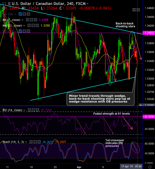 Thereby, the previous upswings on bullish engulfing at 1.3372 now seem to have been totally exhausted, back to back shooting stars are traced out at 1.3377 and 1.3385 levels respectively (on 4H terms) that has plummeted prices below 21DMAs.