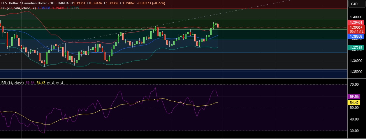 • Immediate resistance is located at 1.3945(Higher BB), any close above will push the pair towards 1.3971(38.2%fib).