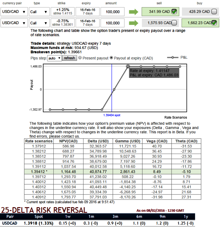The ideal situation for the bull call spread buyer is when USDCAD price to remain unchanged within shorter expiries on short side and only spikes up & beyond the strike price of the call sold when the long term call expires, as we expect USDCAD's fluctuations to show considerable upswings depending on crude's movement in the weeks to come (in next 3-4 weeks).