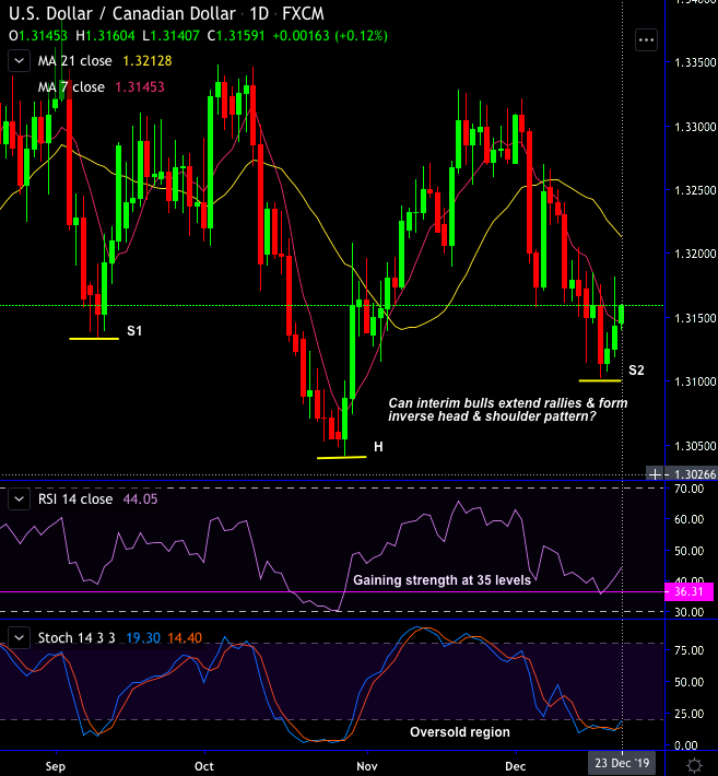USDCAD short-term technical looks neutral/bullish that most likely to form inverse head and shoulder pattern (refer daily pattern), the CAD is consolidating last week’s losses through the upper 1.31 area.