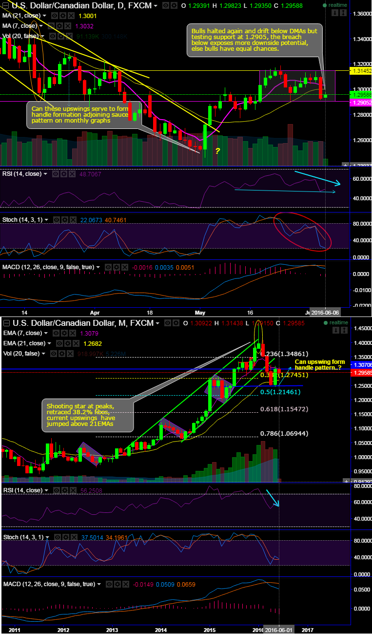 Bulls halted again and current prices drift below DMAs but testing support at 1.2905, the breach below exposes more downside potential, else bulls have equal chances.