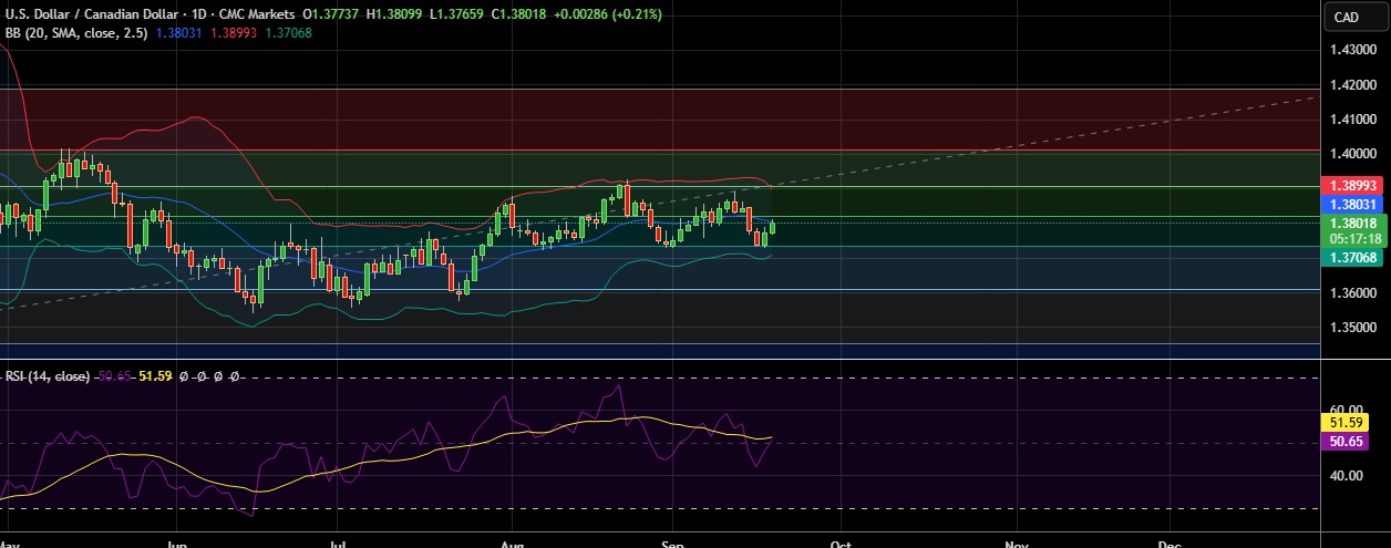 • Support is seen at 1.3737(61.8%fib) and break below could take the pair towards 1.3705(Lower BB).