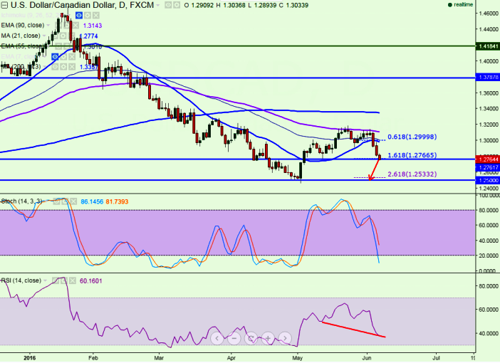 - USD/CAD has broken major psychological support 1.2800 and declined from that level. It is currently trading at 1.27738.