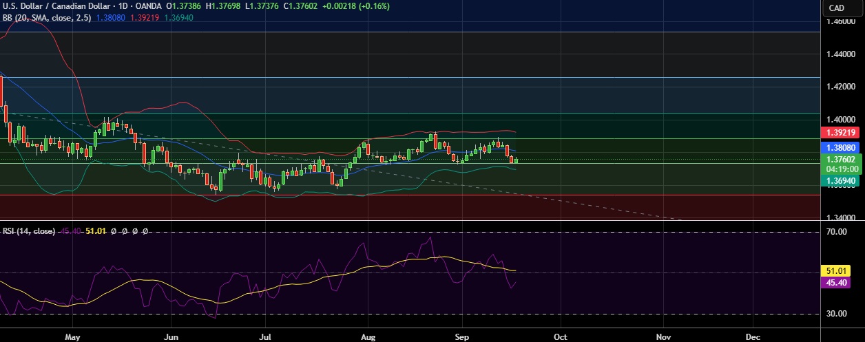 • Support is seen at 1.3733(38.2%fib) and break below could take the pair towards 1.3691(Lower BB).