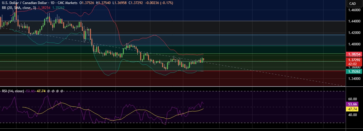 • Support is seen at 1.3697(38.2%fib) and break below could take the pair towards 1.3536(23.6%fib).