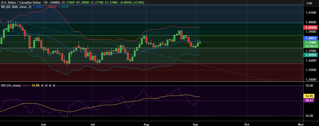 • Support is seen at 1.3727(38.2%fib) and break below could take the pair towards 1.3661(Lower BB).