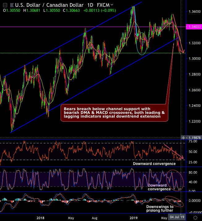 Trade tips: On hedging grounds, at spot reference: 1.3065 levels, contemplating above technical factors, we advocate initiating shorts in USDCAD futures contracts of near month tenors (i.e. July’19 delivery) as further downside risks are foreseen and simultaneously, longs in futures of August’19 delivery not disregarding the major uptrend amid the prevailing global geopolitical risks. Thereby, one can directionally position in their FX exposures. The directional implementation of the same trading theme by further allow for a correlation-induced discount in the options trading also if you choose strikes appropriately.