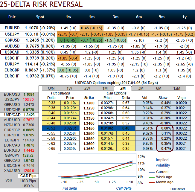 Mounting positive skews in 2m implied volatilities suggests RKO calls on speculative grounds, the USDCAD 2-3m skew has been bid with Trump progresses in the polls, lifting it to its highest level since June 2015.