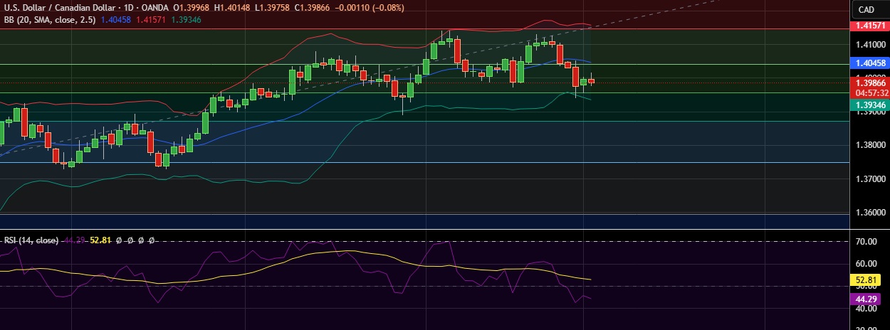 • Support is seen at 1.3956(50%fb) and break below could take the pair towards 1.3937(Lower BB).
