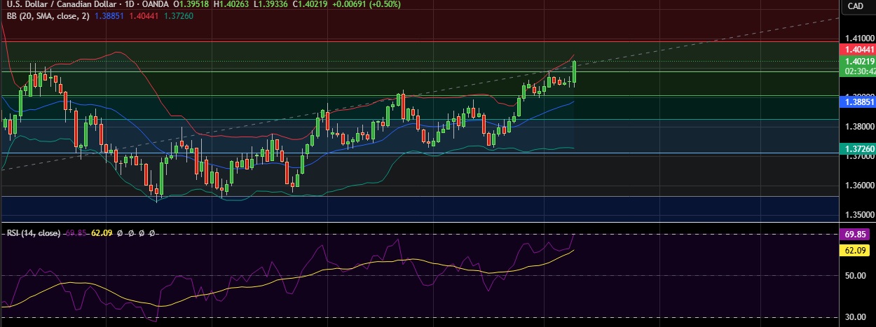 • Immediate resistance is located at 1.4046(Higher BB), any close above will push the pair towards 1.4088 (23.6%fib).