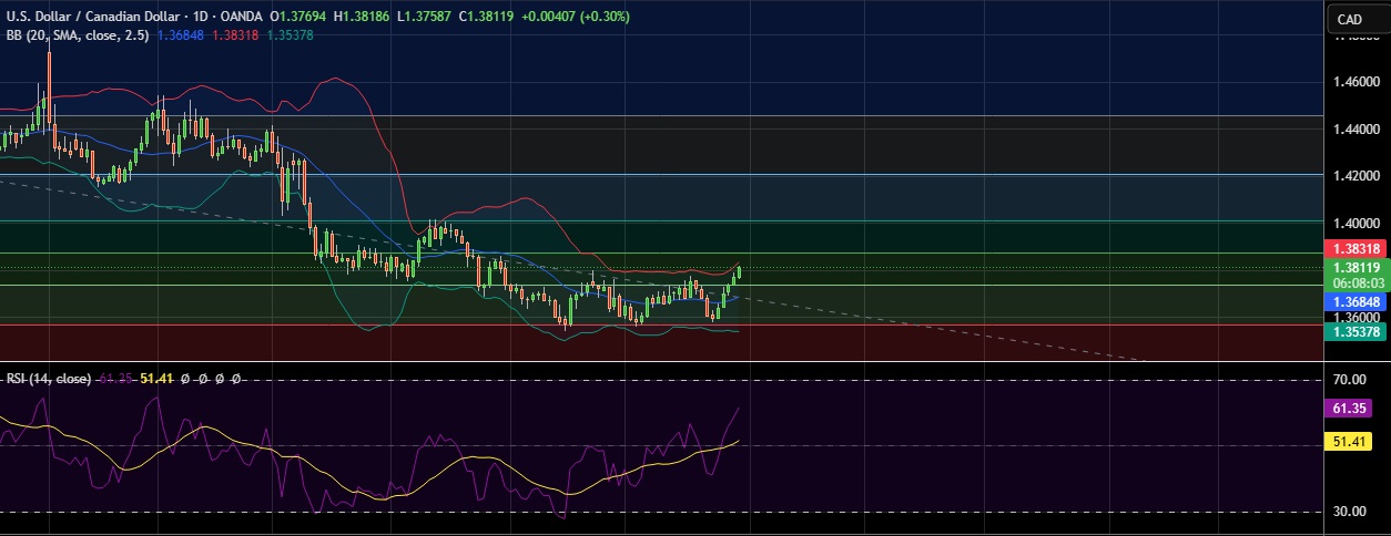 • Immediate resistance is located at 1.3840(Higher BB), any close above will push the pair towards 1.3869(50%fib).